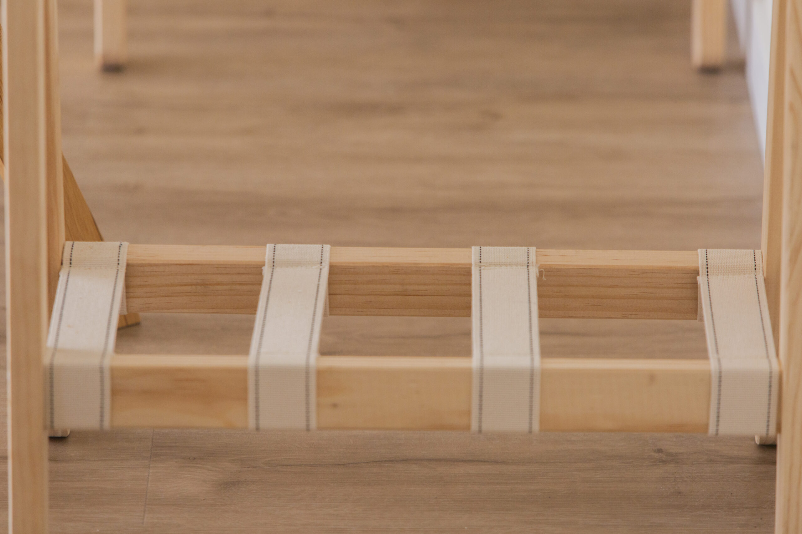 • Madera de pino 100% maciza y local, trabajada para conseguir un acabado redondeado y suave.