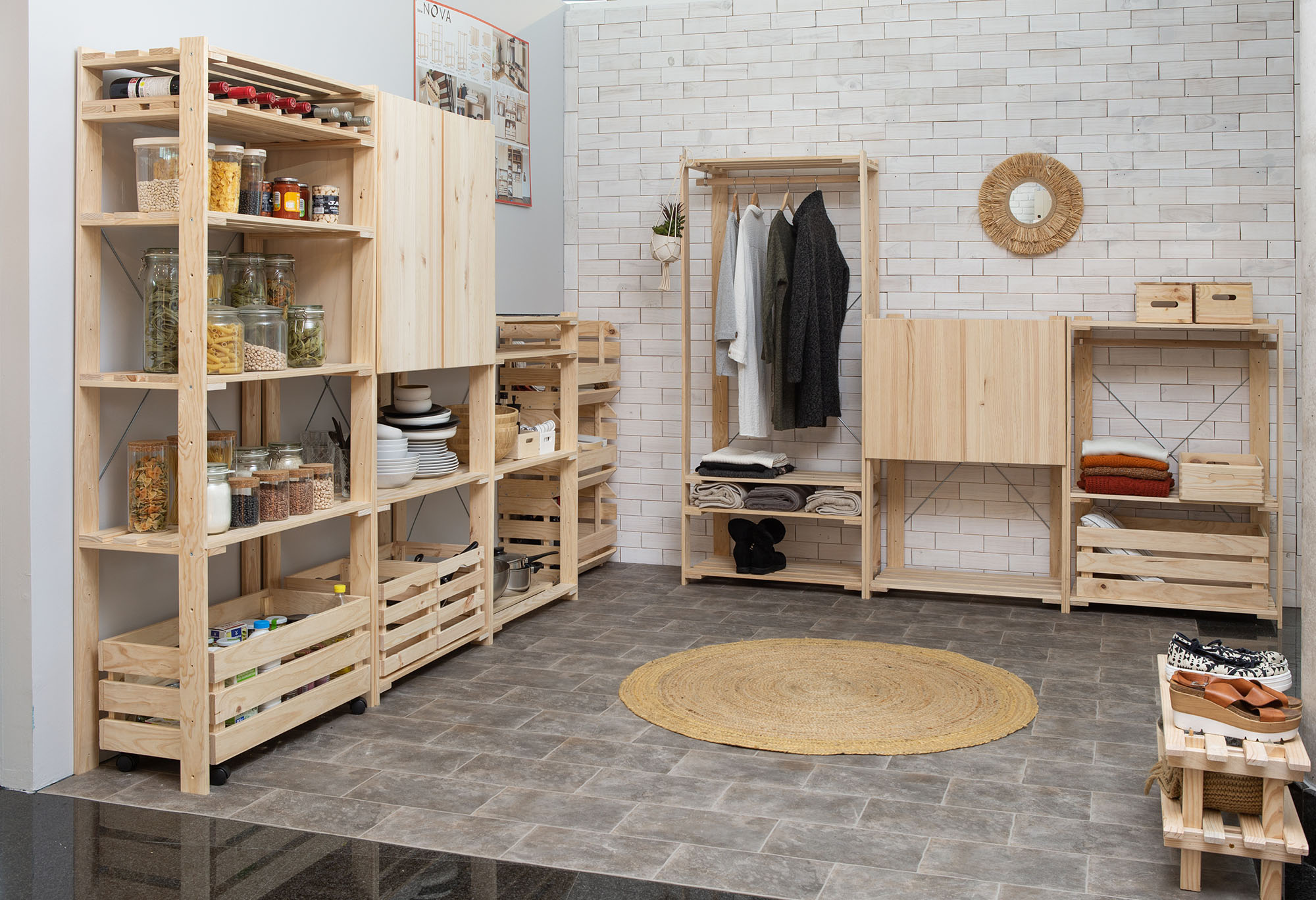 Gure apalategi-sistema berria diseinuzko esperientzia bat da, etxeko, bulegoko edo bestelako inguruneko edozein gune era erraz eta azkar batean aldatzeko gai dena. Pertsonalizazioa funtsezkoa da, zure diseinuaren arkitektoa izateko aukera ematen baitizu. NOVA bildumako bi apalategi eta esekitokiei osagarri ugari jar diezazkiekezu: zurezko kaxak, balda erauzgarria, laneko mahaia, panel antolatzailea, apal gehigarria, botilategia edo armairuak. Norberak erabakitzen du nola antolatu eta erakutsi biltegiratzen dena. Diseinu-aukerak infinituak dira. NOVA produktuak jar ditzakezun guneak ere bai.