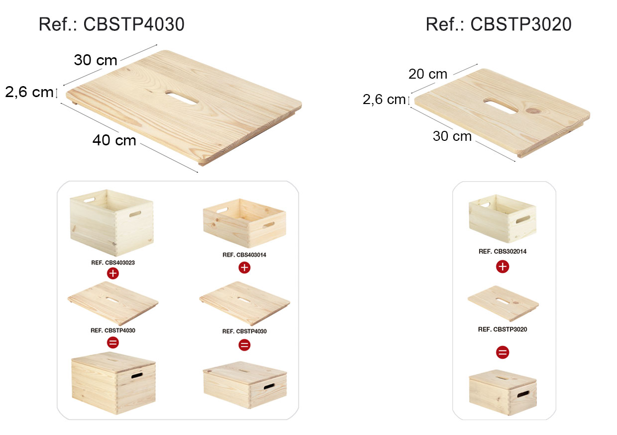 Modularrak diren eta estalkia duten eta ez duten zurezko kaxen bilduma handiari bi berrikuntza hauek gehitzen zaizkie orain: CBS403014, CBS403023 eta CBS302014 kutxetarako zurezko estalkiak. Kaxak ordenaren aliatu handienetako bat dira; barruan era guztietako objektuak gorde eta antola daitezke.